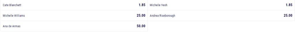 Estas dos actrices son Cate Blanchett por la película Tár y Michelle Yeoh por la anteriormente mencionada Everything Everywhere All at Once. Las otras tres actrices no tienen muchas posibilidades de ganar según las estimaciones de las casas de apuestas.