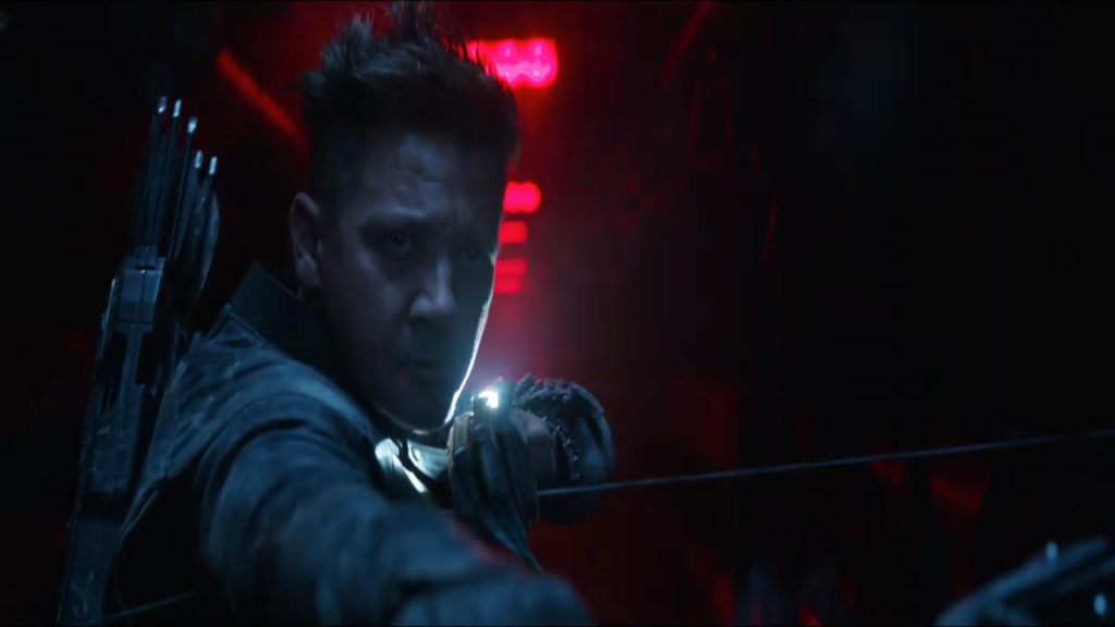 Aunque Clint inicialmente cambió su arco y flecha por una katana y se convirtió en Ronin, aquí vemos que el arco y la flecha aún no están fuera de uso. En esta escena vemos que Hawkeye se encuentra en algún pasillo que me parece un pasillo en un barco o en un submarino. Aunque no sabemos exactamente qué está haciendo allí, es seguro que es importante porque estoy seguro de que en Endgame ni dos segundos de la película estarán allí sin razón.