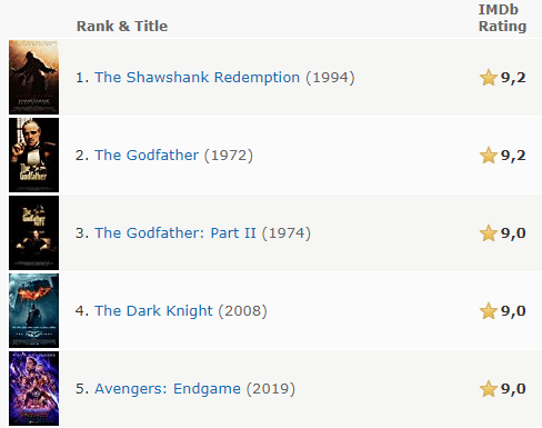 Actualmente (hoy es 27 de abril de 2019), Avengers: Endgame es #5 en la lista IMDb Top 250 con una calificación de 9. Las únicas películas delante de ella son The Shawshank Redemption, El Padrino, El Padrino II y The Dark Knight. Mira la captura de pantalla de la página en el espacio a continuación: