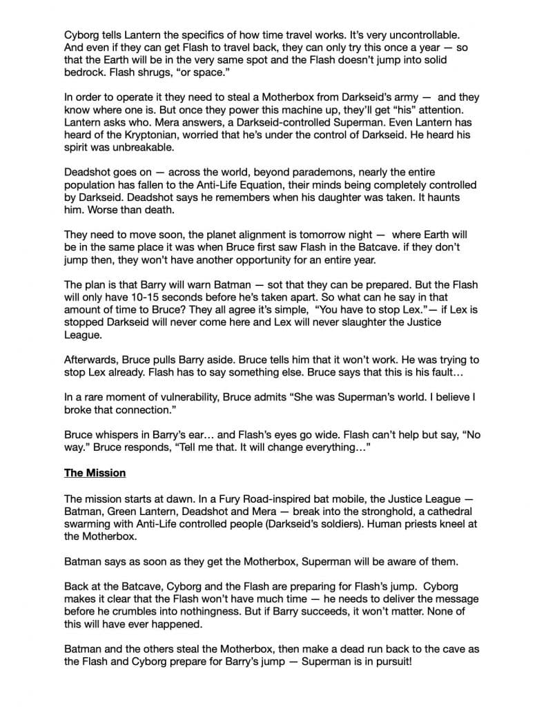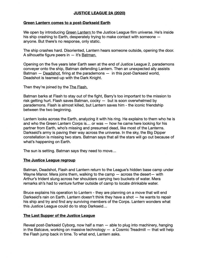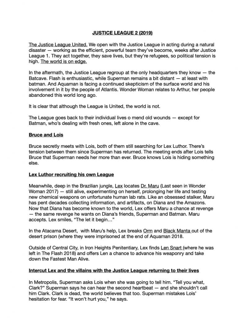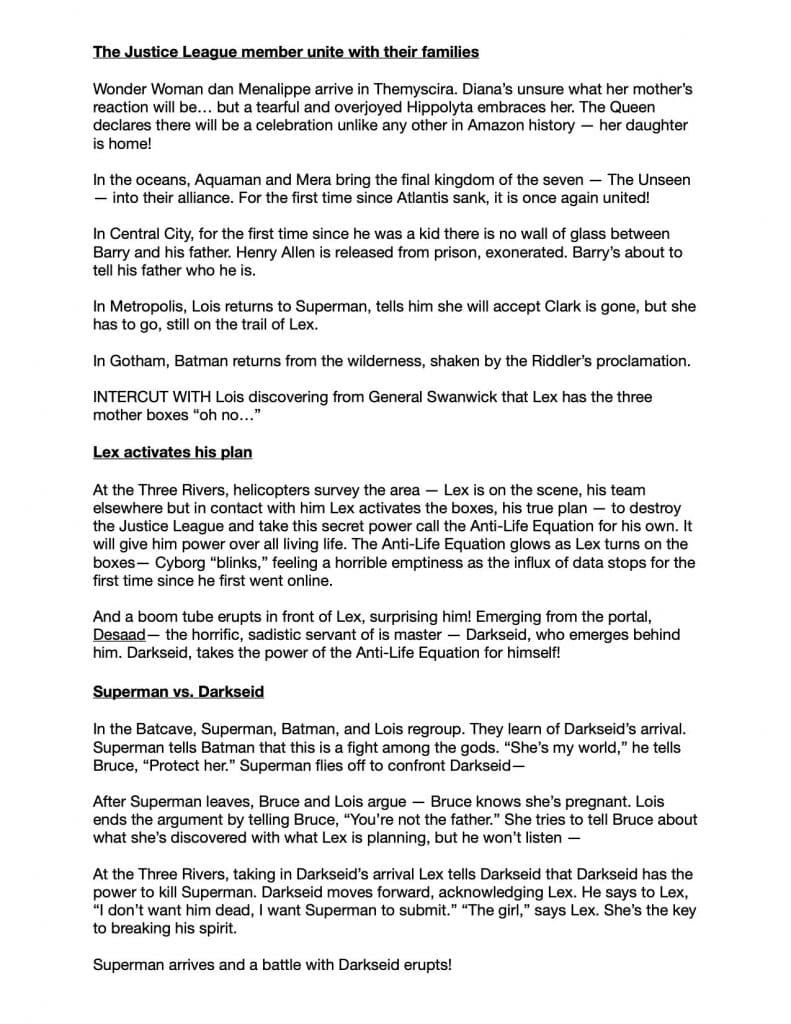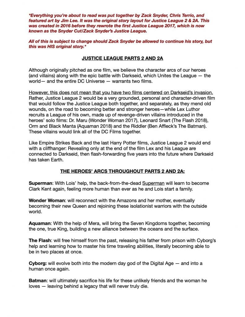 El documento fue evidentemente transcrito por alguien que tuvo la oportunidad de verlo en persona, y el tratamiento supuestamente incluía obras de arte de Jim Lee. En total, se necesita leer unas 10 páginas, donde se describe en detalle cada acción clave y el ritmo de la historia. De hecho, el plan era tan grande que Snyder y Terrio realmente recomendaron dividir la historia en dos partes, haciendo Justice League 2 y otro proyecto que llaman Justice League 2A.