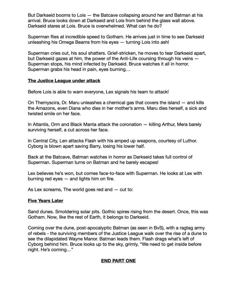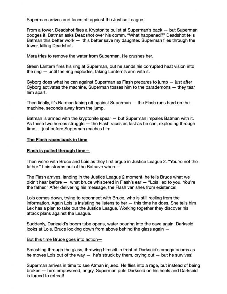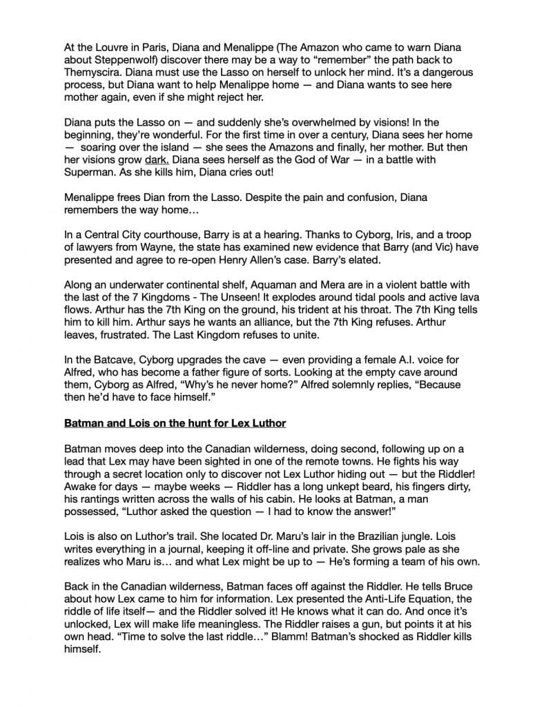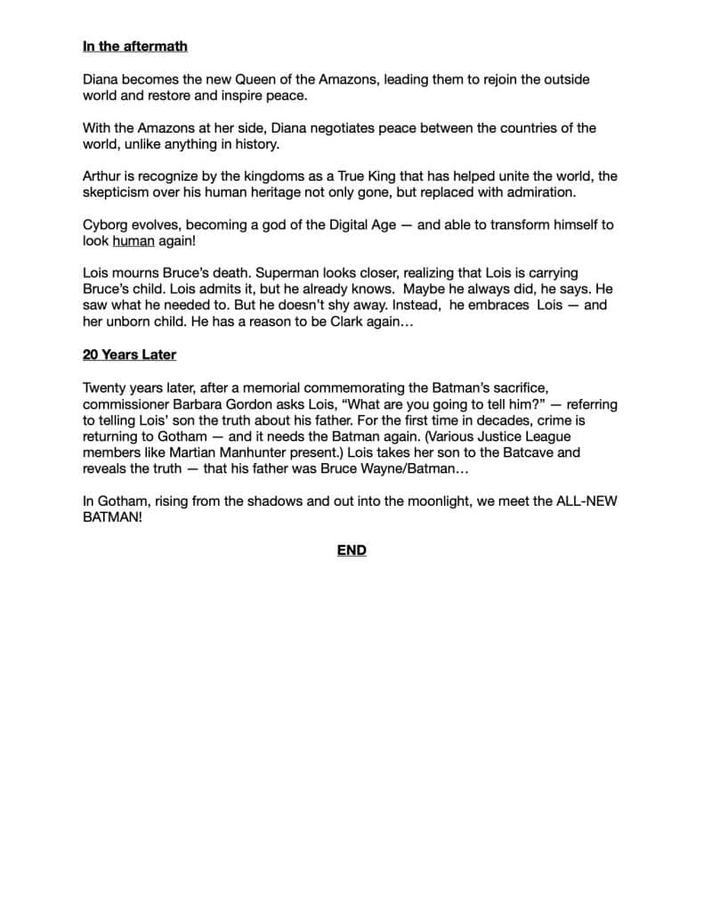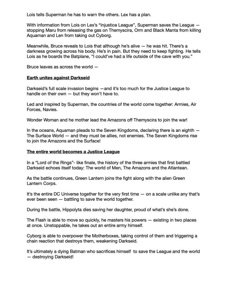 El documento fue evidentemente transcrito por alguien que tuvo la oportunidad de verlo en persona, y el tratamiento supuestamente incluía obras de arte de Jim Lee. En total, se necesita leer unas 10 páginas, donde se describe en detalle cada acción clave y el ritmo de la historia. De hecho, el plan era tan grande que Snyder y Terrio realmente recomendaron dividir la historia en dos partes, haciendo Justice League 2 y otro proyecto que llaman Justice League 2A.
