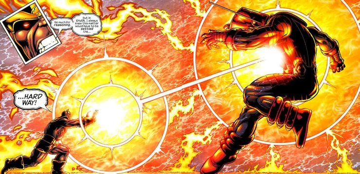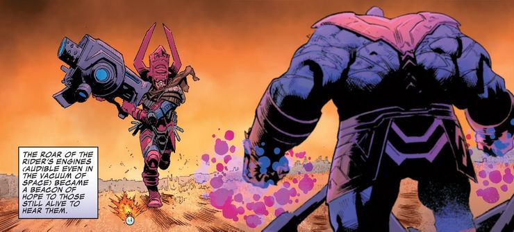 El Ghost Rider cósmico una vez presentó exhaustivamente un futuro en el que Thanos, como una fuerza energética, decapita a Galactus. En todos sus encuentros anteriores, Thanos había utilizado su astucia y otras armas cósmicas para obtener ventaja. Sin embargo, parece que, al menos en un futuro, ha acumulado suficiente poder para manejar por sí solo a otro gigante cósmico.