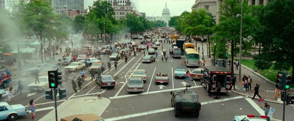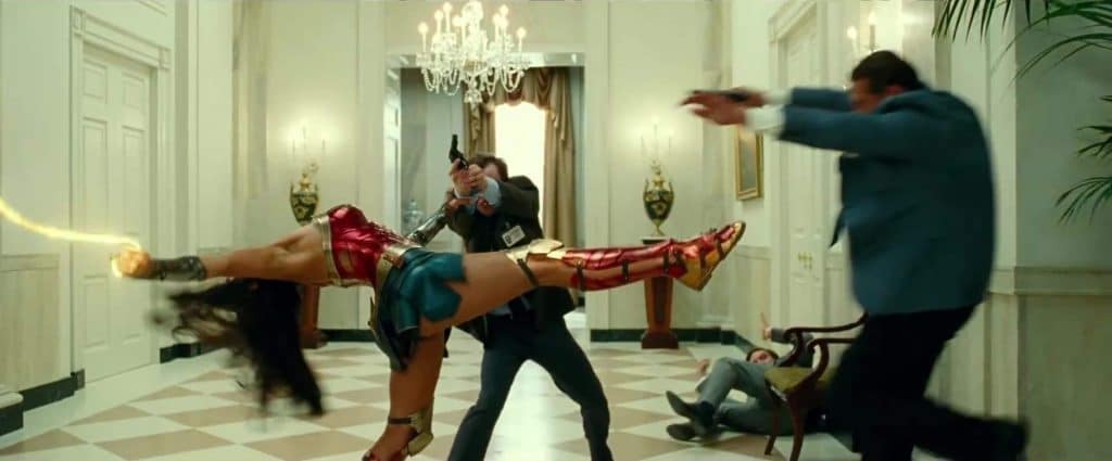 Ya hemos mencionado que el tráiler está impregnado de ese concepto y espíritu de los años 80 del siglo XX, lo cual es algo muy positivo. Personalmente, las películas que logran capturar bien ese entorno y esa atmósfera de la segunda mitad del siglo pasado generalmente ofrecen una capa adicional de calidad que podría despertar una bienvenida nostalgia en las personas que crecieron en esa época. Aunque yo nací un poco más tarde, siempre disfruto ver ese mundo en el que no todo se vivía a toda prisa, y cuando aún puedes ver un Volkswagen Beetle conduciendo por la ciudad con su característico sonido de motor. Esta película ha sido anunciada como la llegada de Wonder Woman a América, y ahora podemos verlo personalmente ya que vemos que la cúpula de la Casa Blanca complementa bien esta toma superior.